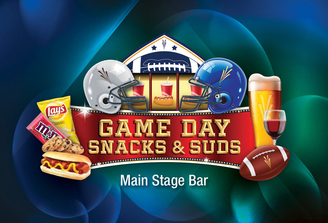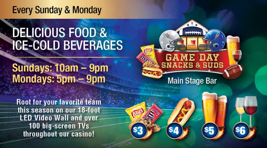During football season, visit our Main Stage Bar for our famous Game Day Snacks & Suds and enjoy $3 chips and candy, $4 hotdogs, $5 draft beers and $6 wines.