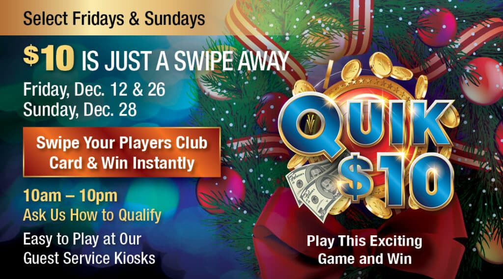 Win $10 instantly at Valley View Casino’s exciting kiosk game, Quik $10! Invited guests will swipe their Players Club card at our guest service kiosks to win!